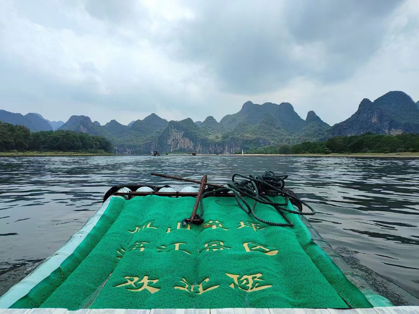 下午我們乘坐小竹筏,游覽漓江。兩岸山峰清秀迤邐,連綿起伏,形態萬千,江岸綠草如茵,翠竹蔥郁,樹木繁蔭。讓人仿佛進入了天人合一的詩意境界,返璞歸真的自由天地。